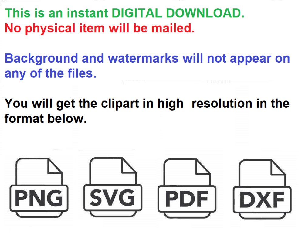 You will get a high resolution stencil Clipart file in the different format below: • SVG file - SVG is a vector graphic format—based on XML and is used to display a variety of graphics on the Web and other environments. • DXF file - DXF is a file extension for a graphic image format typically used with AutoCAD (Computer Assisted Drafting) software. • PNG file - A PNG file is an image saved in the Portable Network Graphic (PNG) format. It contains a bitmap compressed with lossless compression • PDF file - A PDF is a Portable Document Format (PDF) file. PDFs are typically used to distribute read-only documents You can use the PNG or DXF files for your Cricut or Silhouette machine or any other cutting or engraving machine.